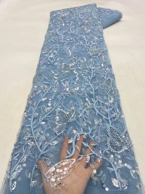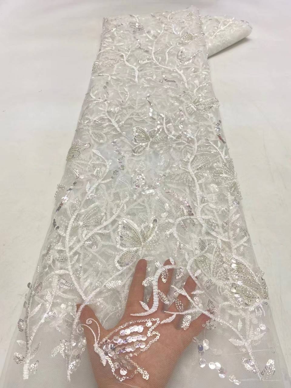 Buntes Hochzeitsspitzen-Stoff 3D Butterfly Perlen, gestickt von Yards mit einem dreidimensionalen 3D-Schmetterlings-Perlen-Stickerei, das luxuriös und exquisit ist und speziell für High-End-Brautkleider und Abendkleider individuell angepasst ist. Jeder Hof ist fein mit Pailletten und Perlenakzenten bestickt. Es ist leicht und atmungsaktiv, geeignet, um Brautschleier, Kleiderdekorationen oder Abendkleider zu machen.